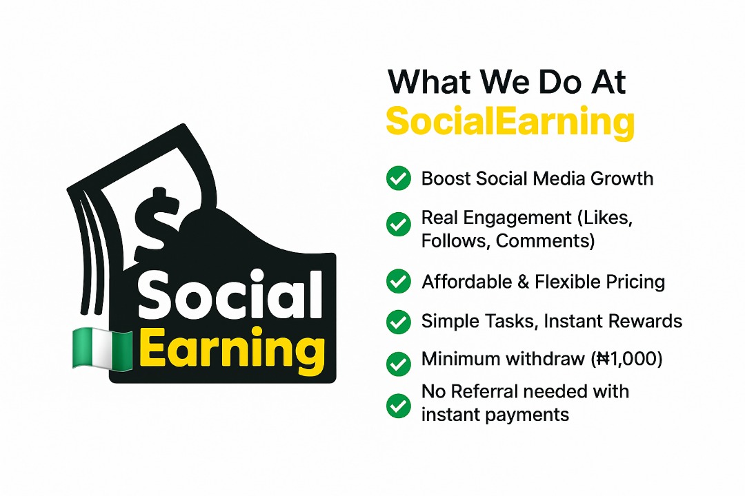 SocialEarning is a workspace platform connecting Advertiser and Earner. Advertiser are does that want to grow their social media presence by posing tasks for earner to perform eg. following of accounts,liking of their posts etc. and the Earner are does that we paid by doing simple tasks on social media eg. following accounts,liking of posts etc.